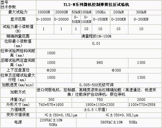 產(chǎn)品概述: TLS-WI系列微機(jī)控制拉壓彈簧試驗(yàn)機(jī)依據(jù)JB/T7796-2005《拉壓彈簧試驗(yàn)機(jī)技術(shù)條件》規(guī)定的技術(shù)要求制成。該型拉壓彈簧試驗(yàn)機(jī)主要用 于測(cè)試各種螺旋彈簧及彈性元件的強(qiáng)度,即在一定的變形量(或高度)下測(cè)試彈簧的試驗(yàn)力或在一定的試驗(yàn)力下測(cè)定彈簧的高度或變形量。 功能特點(diǎn): 本機(jī)主要適用于各種彈簧的強(qiáng)度試驗(yàn)、力學(xué)性能及工序能力分析。 本機(jī)軟件包有速度控制、參數(shù)輸入、數(shù)據(jù)處理、結(jié)果觀察、圖表顯示、圖表打印、數(shù)據(jù)保存等功能模塊組成。 試驗(yàn)方式多樣化,日本彈簧試驗(yàn)機(jī),可以設(shè)置彈簧的試驗(yàn)力,檢測(cè)彈簧的剩余高度或變形量;也可以設(shè)置彈簧的剩余高度或變形量,彈簧壽命試驗(yàn)機(jī),檢測(cè)試驗(yàn)力等功能。 多點(diǎn)自動(dòng)變速采集數(shù)據(jù),彈簧試驗(yàn)標(biāo)準(zhǔn),并自動(dòng)返回到初始位置,整個(gè)試驗(yàn)過(guò)程自動(dòng)化。 過(guò)載自動(dòng)返回,以保護(hù)傳感器不受損壞。 具有強(qiáng)大的數(shù)據(jù)處理及數(shù)據(jù)統(tǒng)計(jì)功能,繪制剛度曲線、計(jì)算彈簧的分段剛度,可以進(jìn)行數(shù)據(jù)統(tǒng)計(jì),繪制正態(tài)分布圖、計(jì)算工序能力指數(shù)。采用數(shù)控電機(jī)調(diào)速系 統(tǒng)或進(jìn)口交流伺服電機(jī)及調(diào)速器和精密滾珠絲杠副組成傳動(dòng)系統(tǒng),與高精度負(fù)荷傳感器、位移傳感器及數(shù)字式數(shù)據(jù)采集卡、PC組成測(cè)控系統(tǒng),實(shí)現(xiàn)了穩(wěn)定可靠運(yùn)行 及精確測(cè)量。 技術(shù)參數(shù): ![]() ![]()