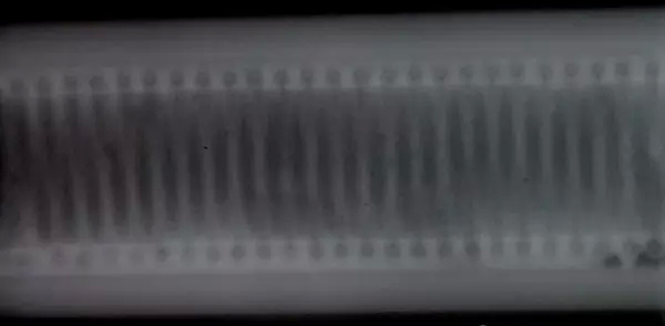 再從目前的焊接工藝水平來看經(jīng)過焊接的管體內(nèi)部表面非常的粗糙如圖2所示。而產(chǎn)品的工藝要求中并未對焊接后的內(nèi)部表面情況提出要求,只要求加熱器與管壁焊接良好不能存在加熱器與管壁未焊接相連的情況。因此由于內(nèi)部表面的各種堆積、裂紋等粗糙現(xiàn)象的存在將會使在超聲檢測中出現(xiàn)各種雜波影響檢測結(jié)果。另外經(jīng)焊接后的管體表面也很粗糙達(dá)不到超聲檢測所需的表面條件。因此超聲檢測也不適合加熱器與管體內(nèi)壁焊接情況的檢測。