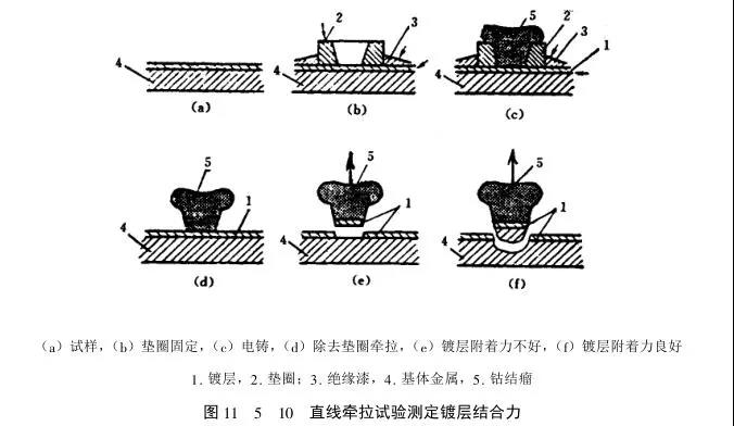 直線章拉試驗(yàn)可直接在鍍件上進(jìn)行。首先在試件鍍層表面,用一非導(dǎo)體墊國固定在被測部位上,并在墊國以外的鍍層表面加以絕緣層,然后在墊國以內(nèi)的鍍層上電鑄鈷或其它金屬,經(jīng)一定時(shí)間,在該鍍層上沿墊國內(nèi)壁形成一個(gè)金屬結(jié)瘤,電鑄結(jié)束后取下墊國,除去絕緣層,將鑄有金屬結(jié)瘤的試件置于專用的張力測試機(jī)上,以機(jī)械力將般層牽拉至斷裂見圖11_5_10。根據(jù)般層剝離時(shí)用力的大小及般層結(jié)合面積可計(jì)算出般層的結(jié)合強(qiáng)度。