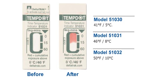 DeltaTrak提供滿足你各種需要的標(biāo)簽:WarmMark溫度標(biāo)簽、高溫?zé)針?biāo)簽和TempDot時(shí)間溫度指示標(biāo)簽顯示溫度變 化超過(guò)預(yù)設(shè)的時(shí)間。FreezeCheck和ColdMark溫度標(biāo)簽用于顯示運(yùn)輸溫度低于0℃。商業(yè)洗碗機(jī)使用的TempDot高溫?zé)針?biāo)簽可顯示最終沖 洗水溫是否達(dá)到71℃(HACCP體系所要求的溫度)。 TempDot時(shí)間溫度標(biāo)簽,,型號(hào)51030-51032,,是一種低成本的標(biāo)簽,,可顯示溫度高于閾值長(zhǎng)達(dá)60分鐘。當(dāng)溫度超過(guò)臨界值,,標(biāo)簽顏色變化開始,,但溫度下降到閾值之下時(shí),,標(biāo)簽顏色變化停止,,如此來(lái)顯示累積溫度超過(guò)的時(shí)間-,,對(duì)于許多質(zhì)保應(yīng)用來(lái)說(shuō),度分鐘是非常的重要的概念。有三種溫度閾值5℃、8℃和10℃可供選擇。 這個(gè)低成本標(biāo)簽可以指示一段長(zhǎng)到60分鐘暴露在臨界點(diǎn)溫度。